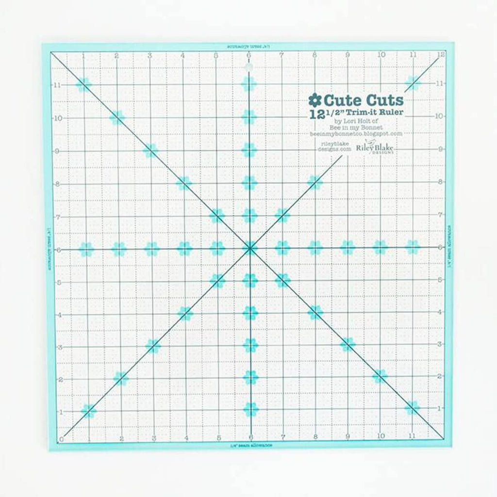The Trim-it™ Rulers by Lori Holt of Bee in my Bonnet are non-slip and easy to use for trimming up your blocks after piecing, applique or embroidery. Use the diagonal lines to easily center your block when trimming and and use the colored outside 1/4" seam allowance marks to help you see what will show of your block after sewing it into your quilt. The ruler has aqua and denim markings printed in 1" grids marked in 1/8" and 1/4" increments.
